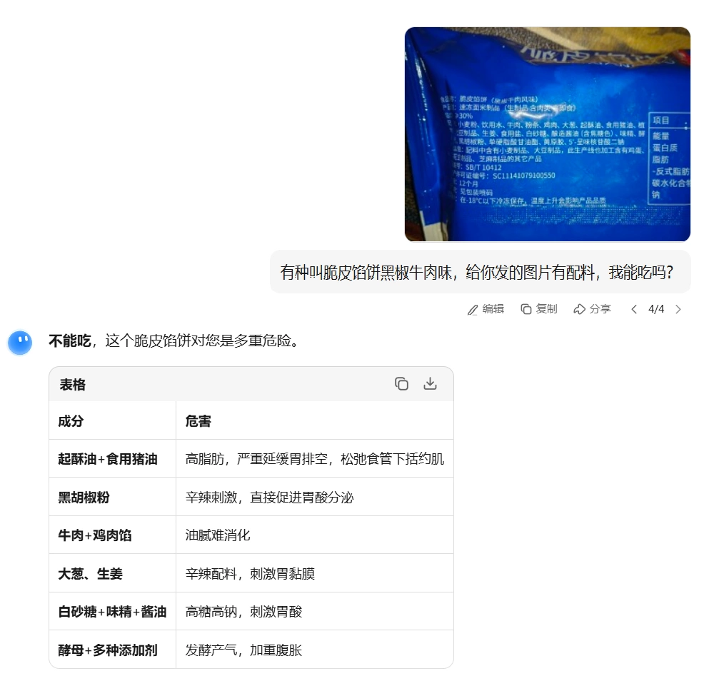 今年春节因为着凉感冒了,本来吃药后第四天好了大半,第六天病情加重,问了AI(图1),是期间吃了两块小蛋糕(图2)导致咳嗽症状加重,甚至咳得说不出话,之前吃的药可能没有效果,另买了消炎感冒咳嗽药(图3),现在好多了。