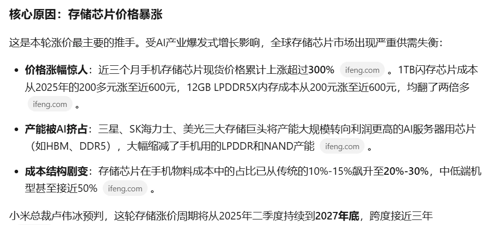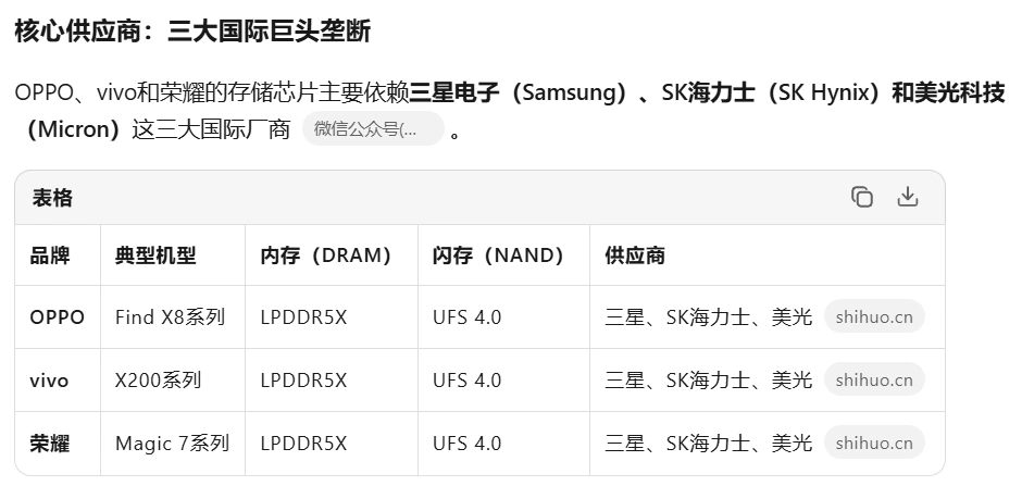 受AI算力需求激增影响,三星、SK海力士和美光科技这三家存储厂商把产能大规模转向利润更高的AI服务器,缩减手机存储芯片产能(图1~图2),而OPPO、vivo和荣耀手机的存储芯片又依赖于这三个存储厂商,导致OPPO手机(含一加)、vivo手机(含IQOO)和荣耀手机三家手机产品不得不涨价500元左右(图3~图5)。